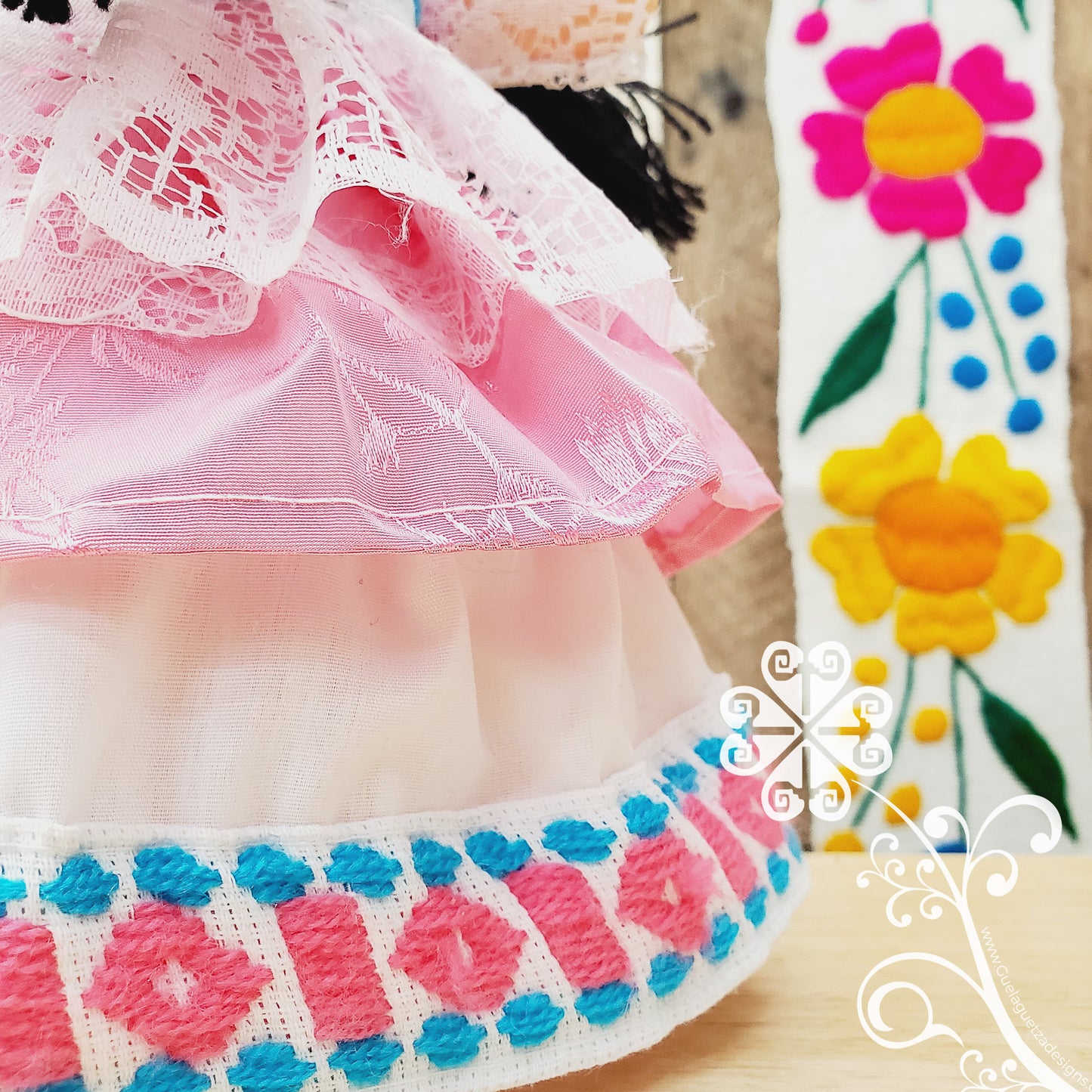 Her dress inspired on the otomi culture, delicate embroider flowers and shapes on the skirt and top, cotton lace, and a removable apron. Her head is decorated with a ribbon headband and braids.