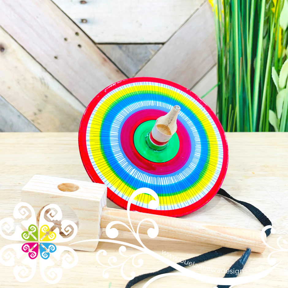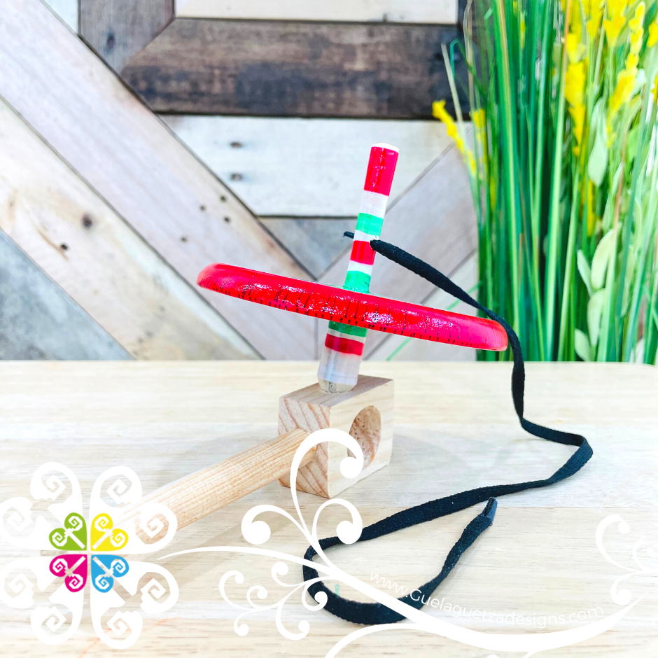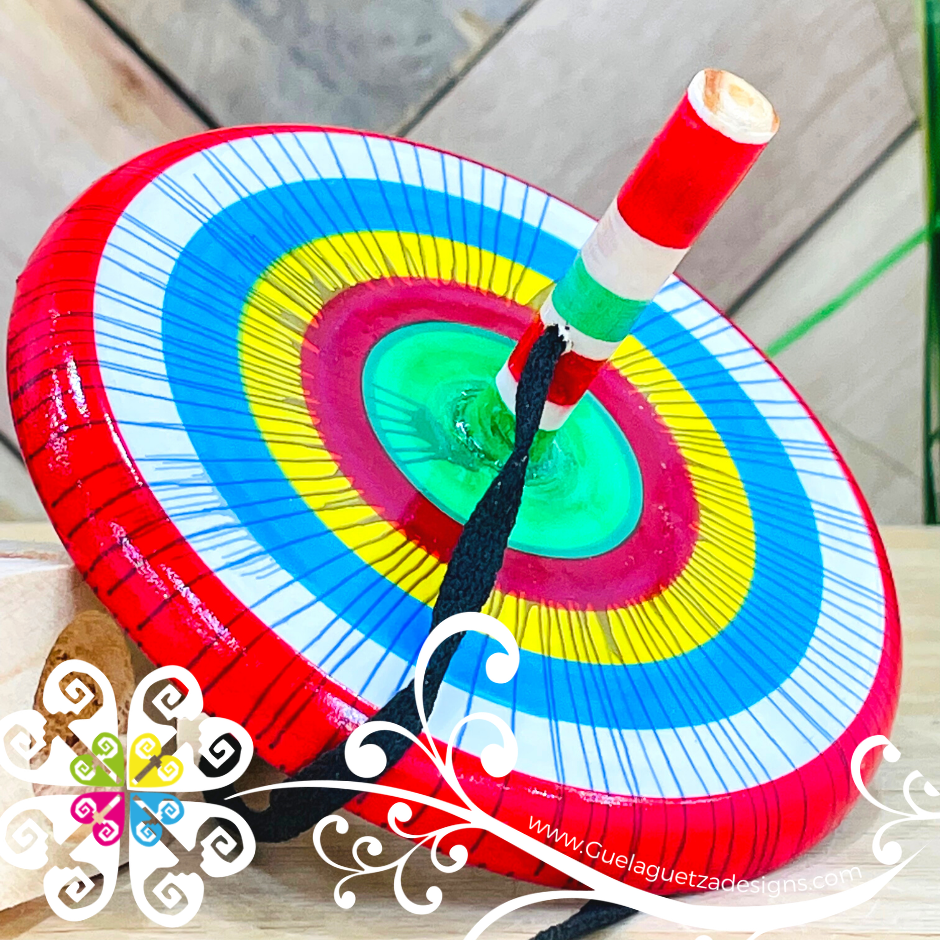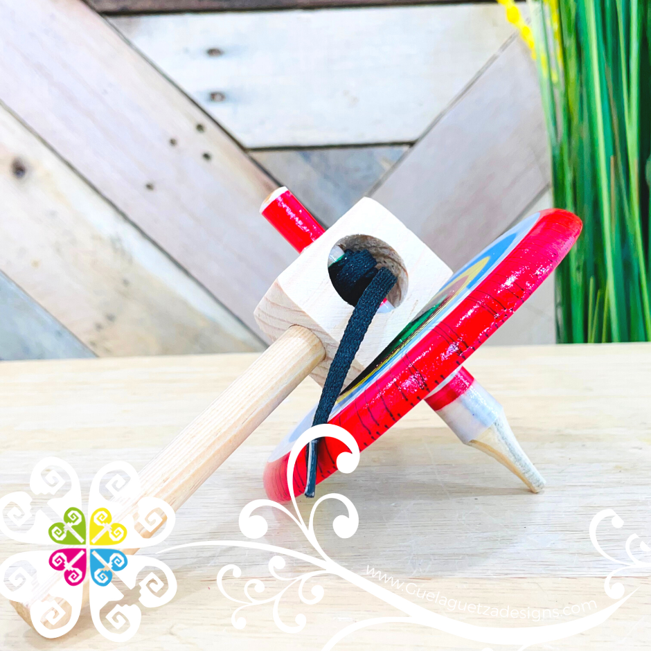 Your kids (or yourself) will love the endless fun with this super cute pirinola. Made with wood and hand painted with multicolor designs. Just insert the pirinola base into the smaller hole from handle, insert the cord inside the tiny hole from the pirinola base, wrap around the cord until a small cord is left, hold the handle with one hand and with the other pull the cord as fast as you can! Enjoy!
