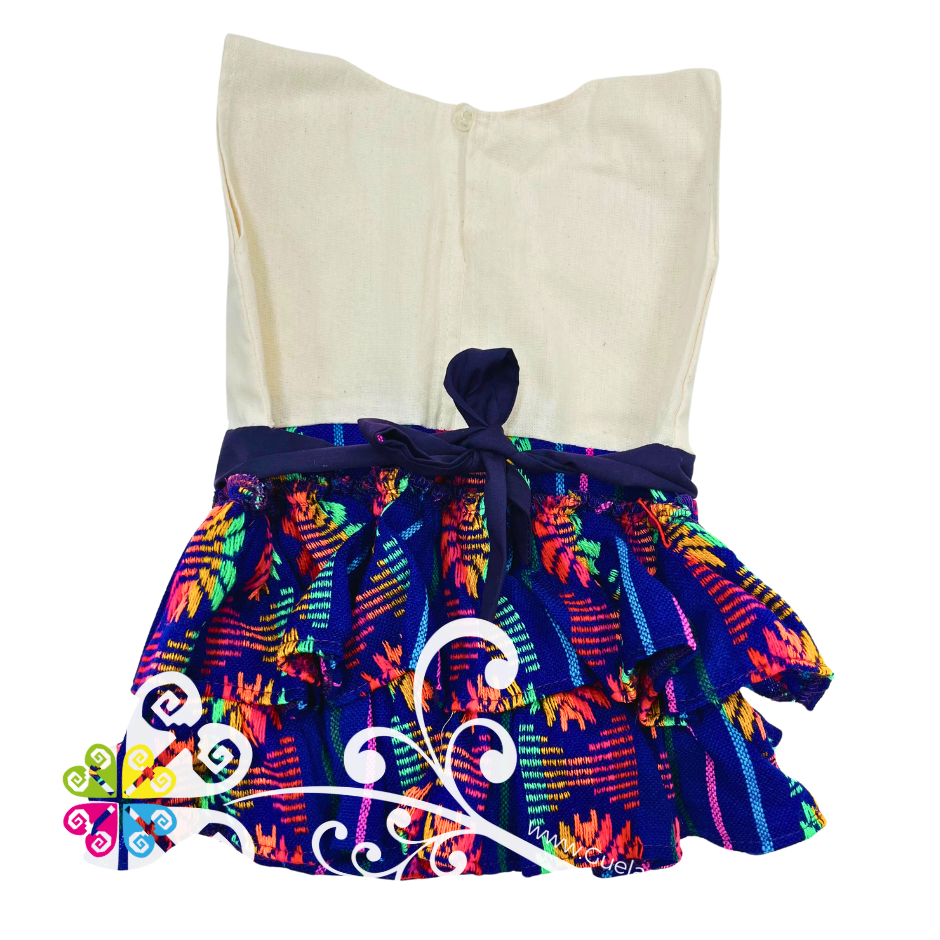 This set features a machine embroider colorful bib made with beige manta carolina with button on the back for easy fitting. The bottom part is attached to the top and is made with cambray fabric; two ruffle layers with diaper cover with snap buttons for easy diaper changing. You will love the strap around the waist to help adjust it to your princess and to add a spark of cuteness, the outfit is accompanied by a matching headband.