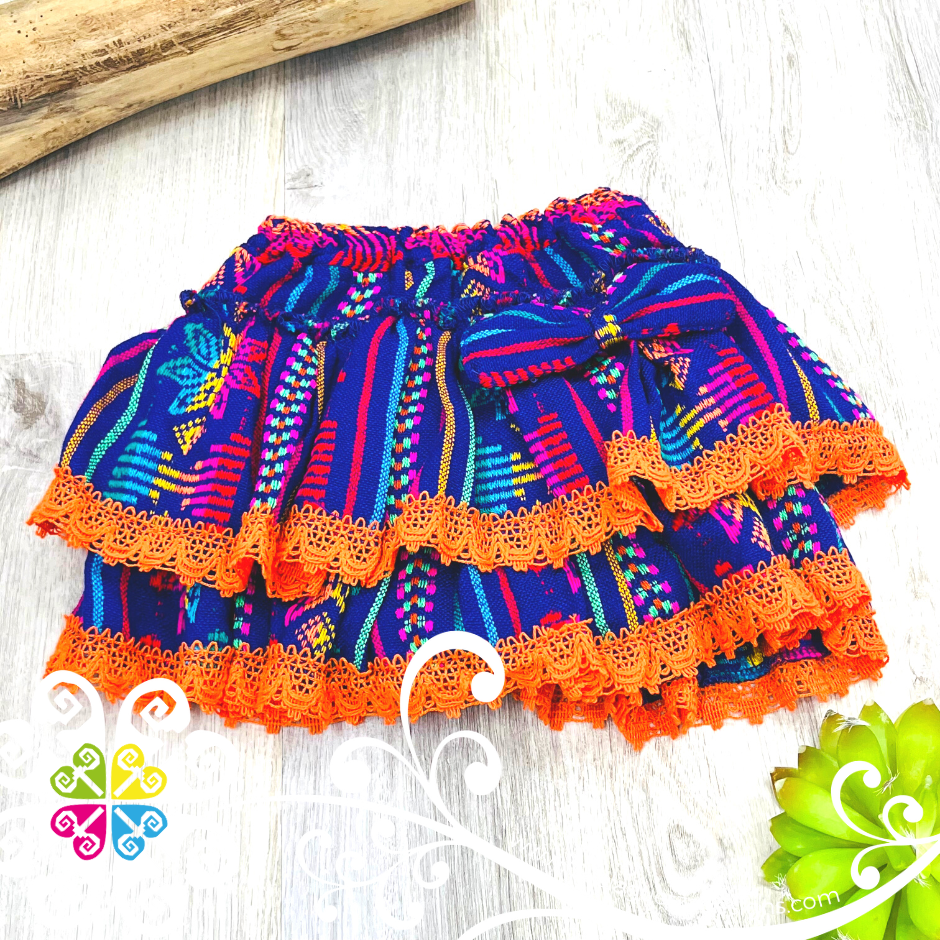 A darling, three-piece outfit composed of a skirt, blouse, and headband. The skirt is made with a multicolored fabric, with two layers, cotton lace, and an elastic waist. The white blouse is stitched in multiple colors. Embroider may vary from picture. Finally, the outfit is accompanied by a headband made of the same material as the skirt.