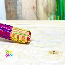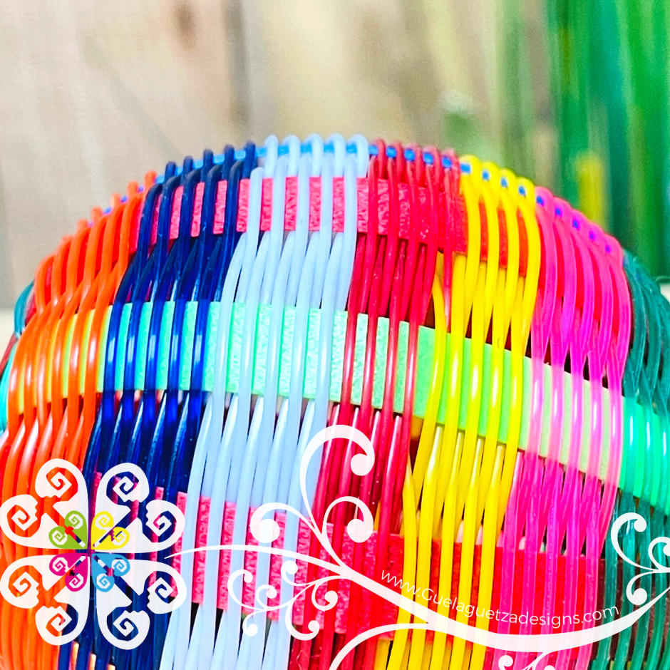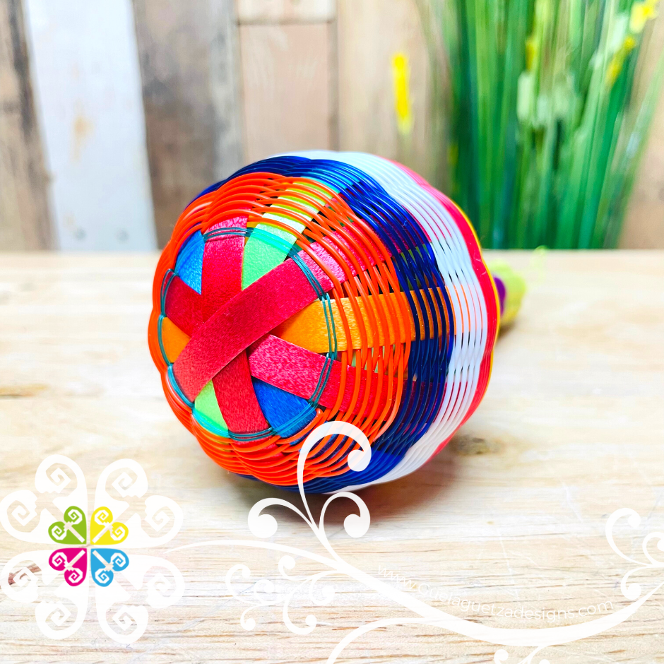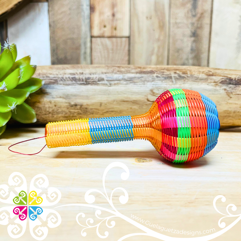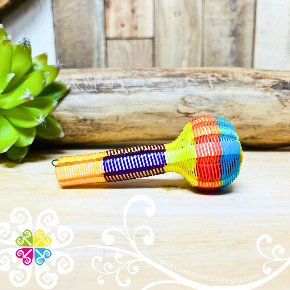 Beautiful one of a kind rattle made with colorful synthetic strings. Hand woven to have a super cute rattle.