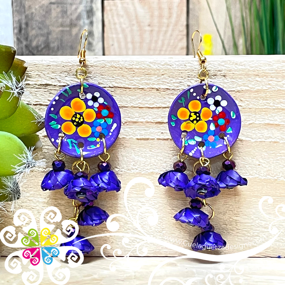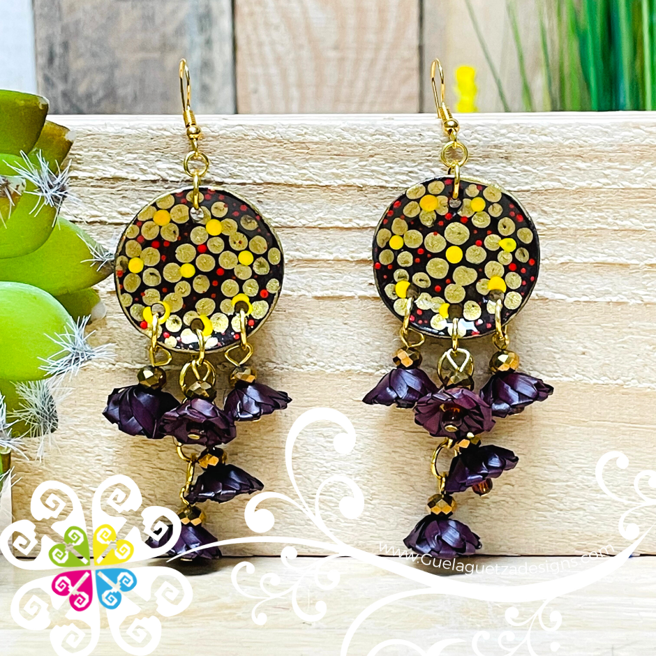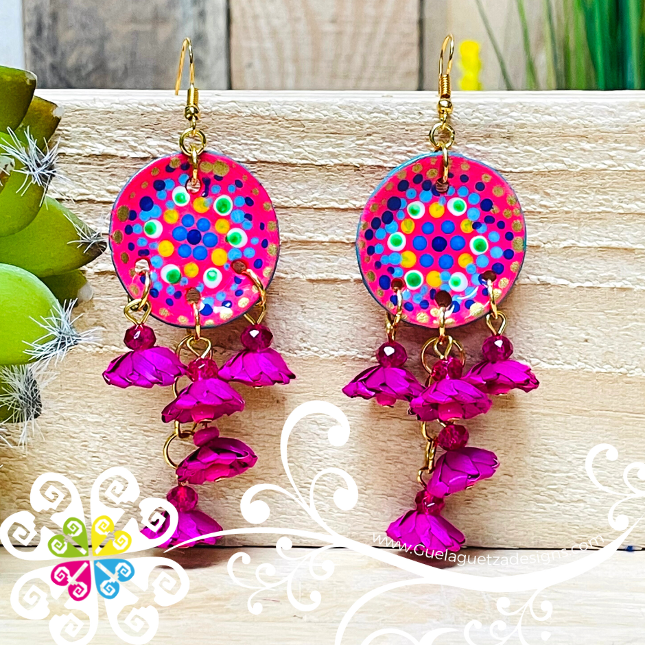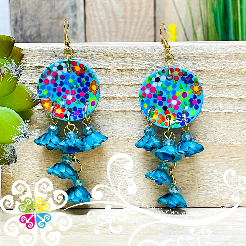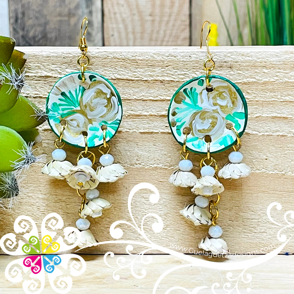 This earrings is 100% handwoven by Mexican artisans using sustainable and biodegradable materials such as palm leaves and cotton threads. The round top of the earring features Mexican Clay hand painted with vibrant multicolored dots, flowers and various shapes!