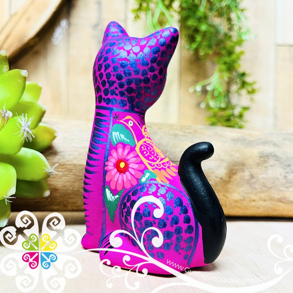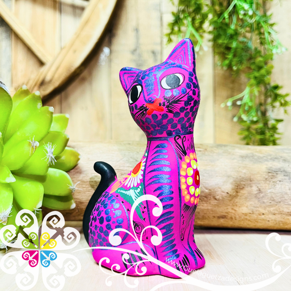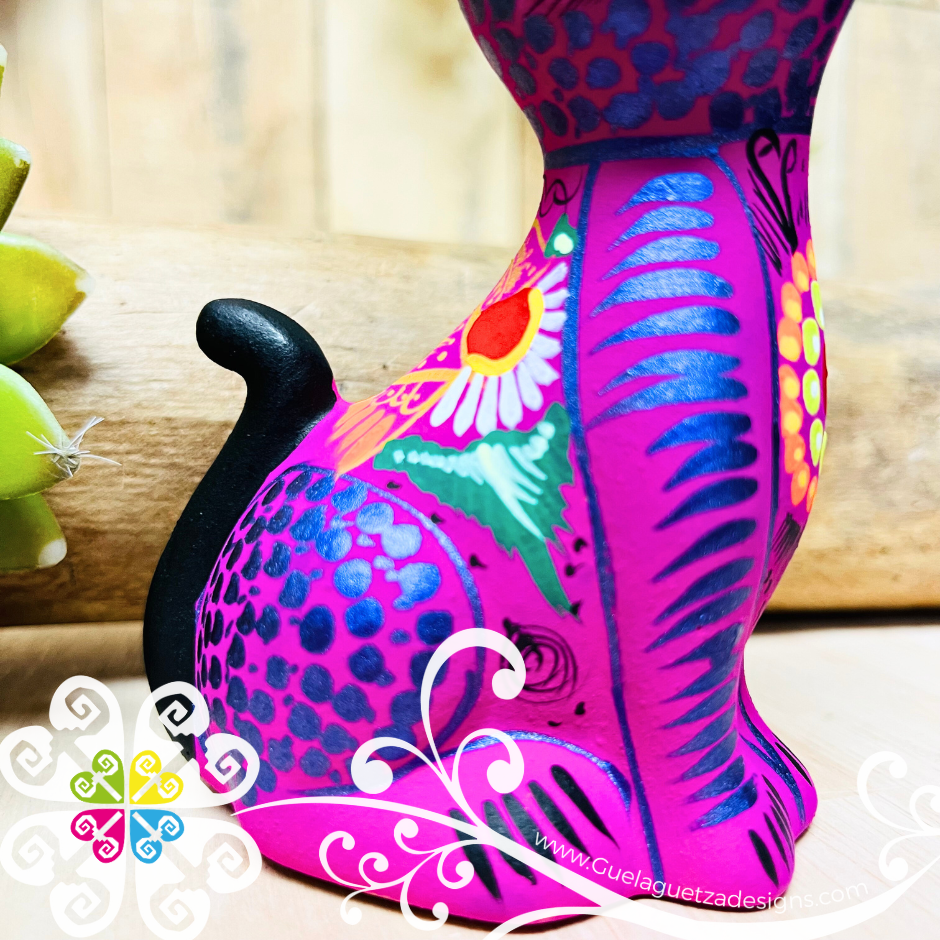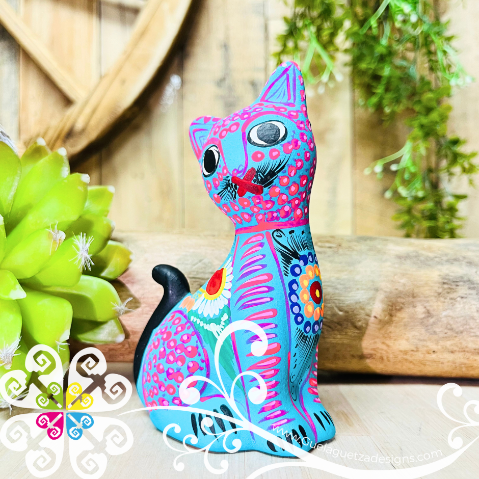 Beautiful hand painted clay cat from Guerrero, Mexico. Perfect piece to decor any small space from your house or office. Each design is very unique, colors may vary slightly from the pictures.