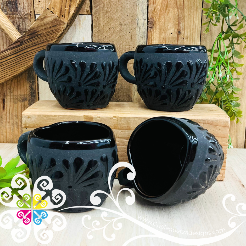 Set of 4 Black Corazon Clay Mugs - Set Taza Barro