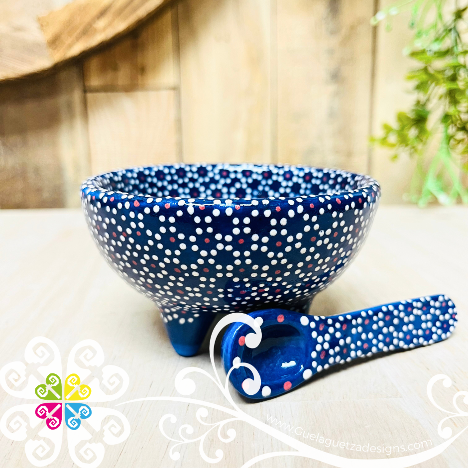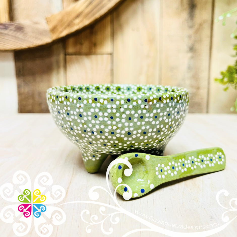 Beautiful clay molcajete with spoon created using ancient process by Mexican artisans from Capula, Michoacán, Mexico. Each design is crafted by hand by Family Glez Ayala with love and passion. Perfect for decoration or to pour your favorite salsas!