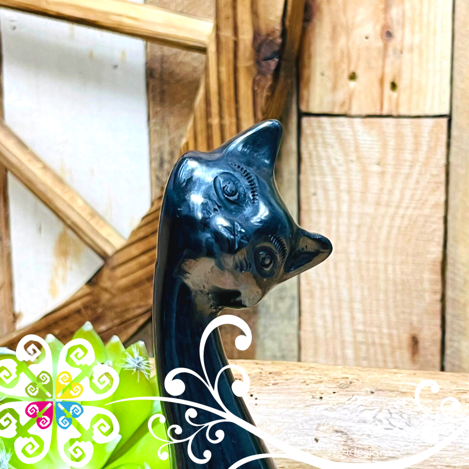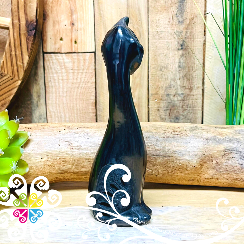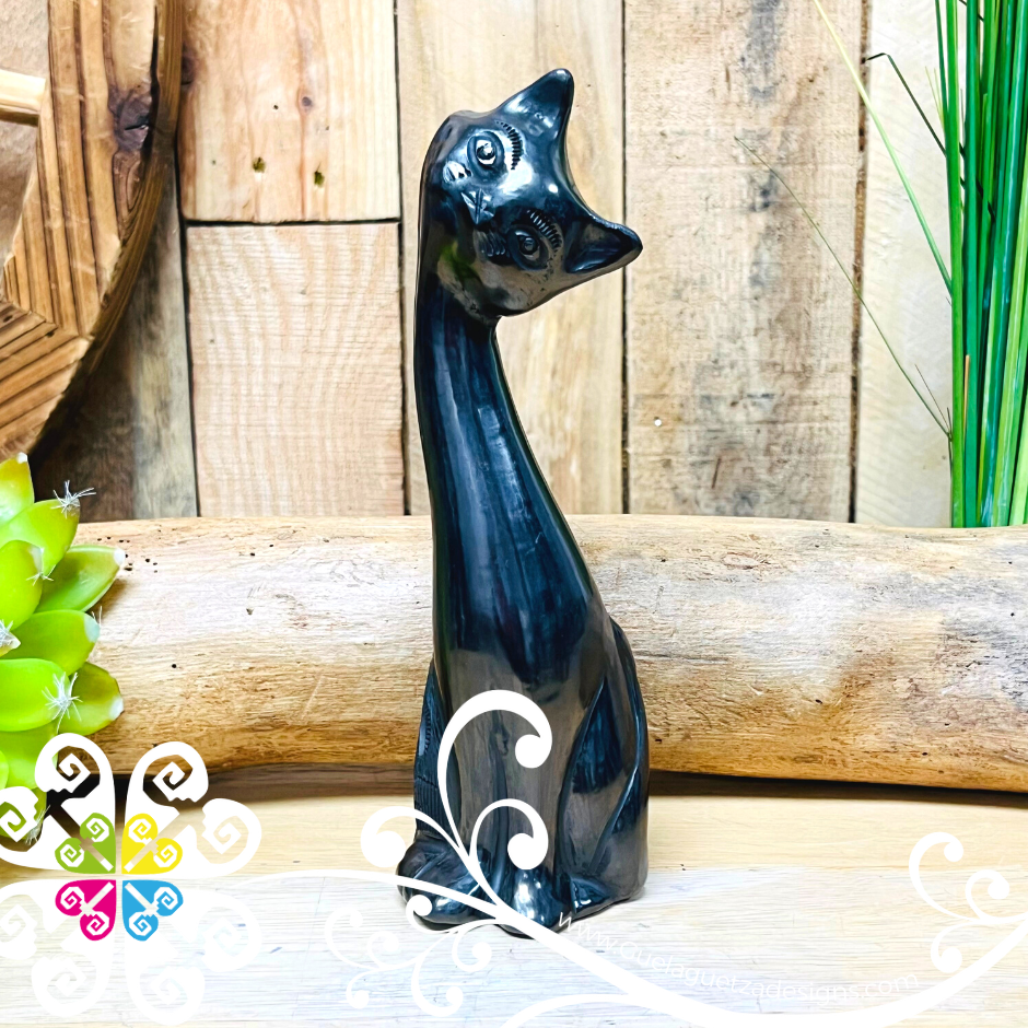 Medium Long Neck Cat Black Clay Figure - Barro Negro Oaxaca
