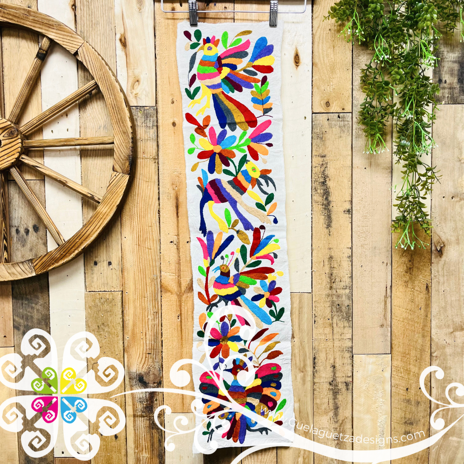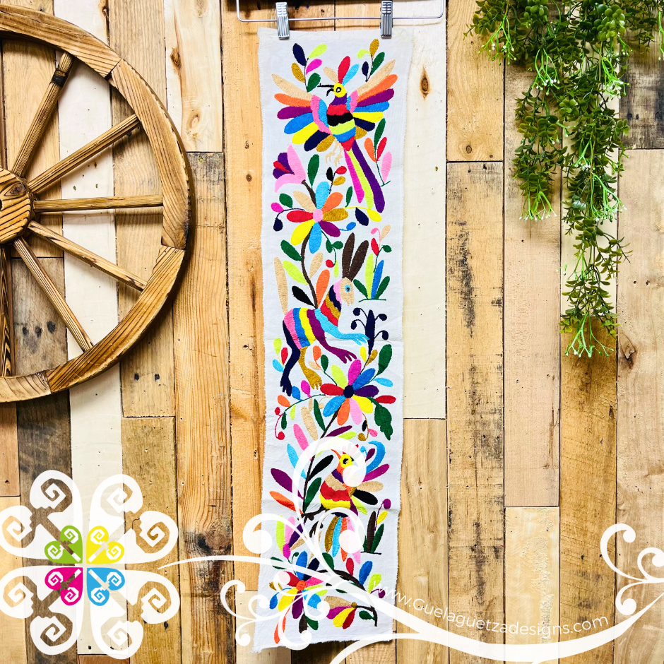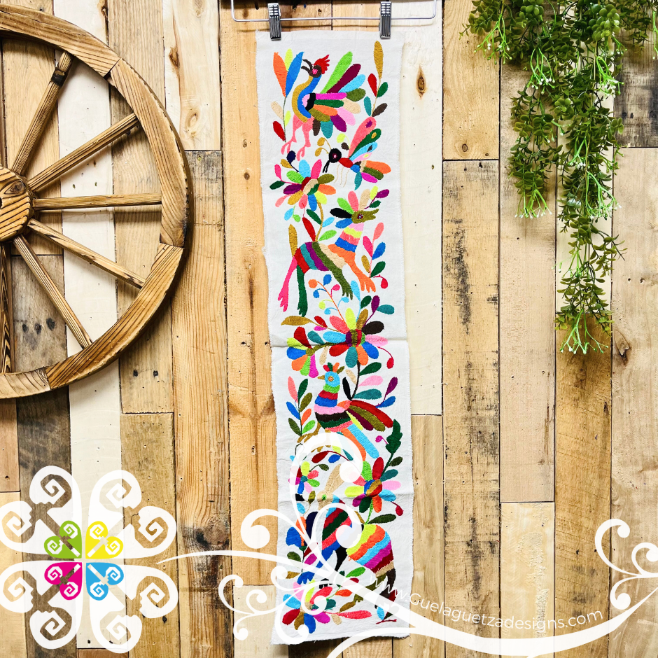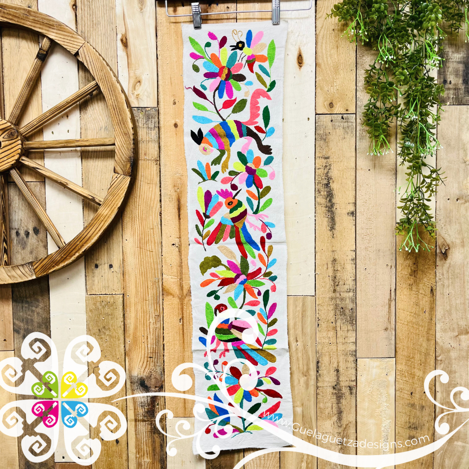You will fall in love with this stunning half sized hand embroidered table runner. Hand crafted by Mexican artisans from Hidalgo, Mexico. Each piece features beautiful flowers, birds and animals inspired by the Otomí culture.