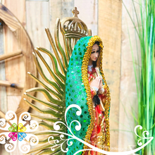 You will love this super cute Virgencita de Guadalupe! Hand craft and painted in Mexico. Base is made with artisan resin, and the gold aura is made from plastic. Hand painted with acrylics and a layer of gloss.