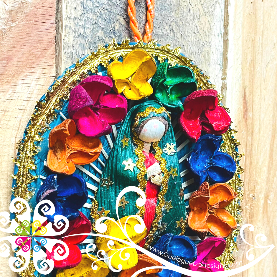 Super cute Virgen de Guadalupe perfect for hang up anywhere to cheer up the space. Handmade using corn husk from Guerrero's fields, decorated with sparkling lace and seeds. Flat design with string to hang.