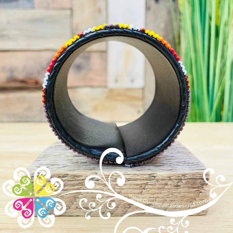 Unisex snap on bracelet made with petite glass beads. Each design uses different shapes and colors, featuring a vibrant rainbow palette or just plain colors. Sturdy and comfortable material under the design.