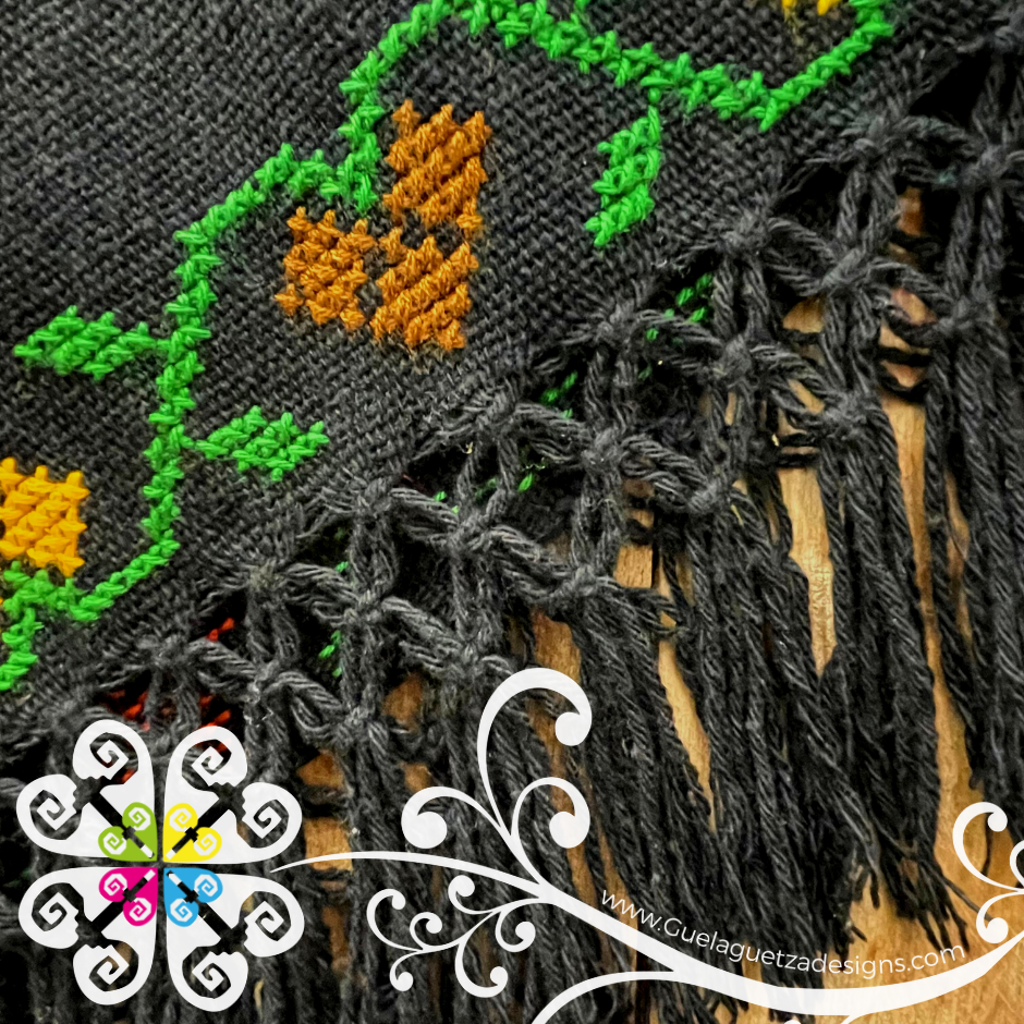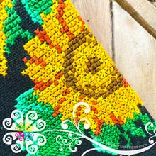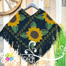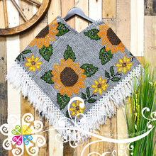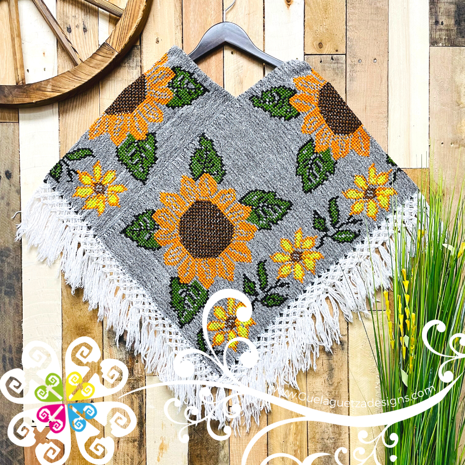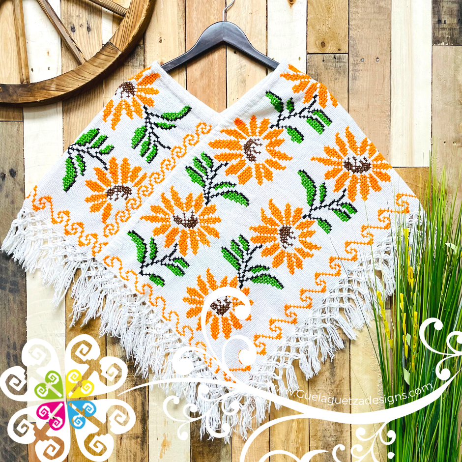 Beautiful one of a kind embroider poncho. Base is made with plain cotton and acrylic threads and decorated with hand made cross stitch embroider. Featuring beautiful sunflowers inspired on Mexico's flora. Same design in front and back.