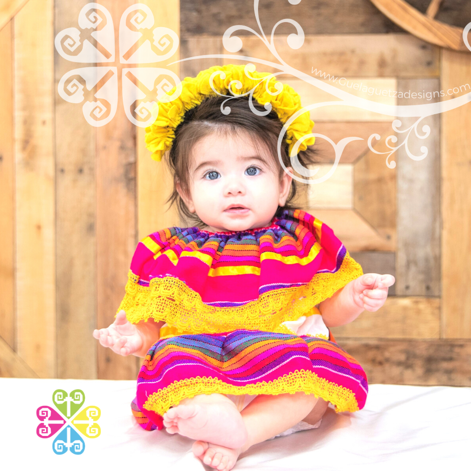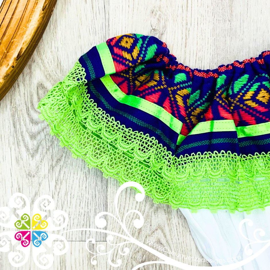 Traditional children Campesino dress with handmade embroider on the tap and skirt. Fresh and comfortable design with elastic around the waist. Made with 'manta corrugada' and decorated cotton lace and cambray colorful fabric.