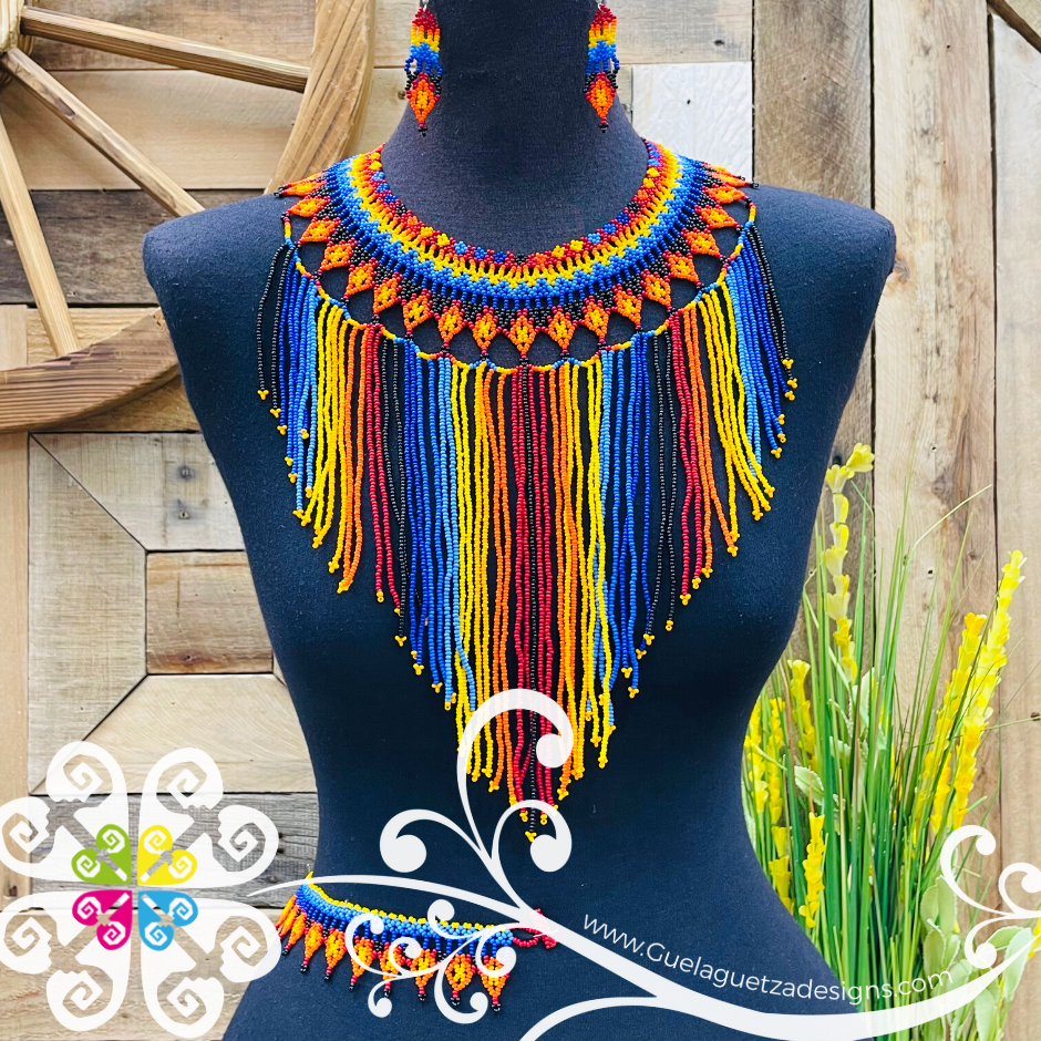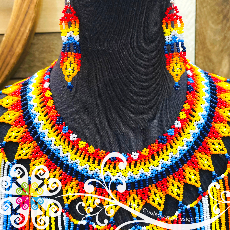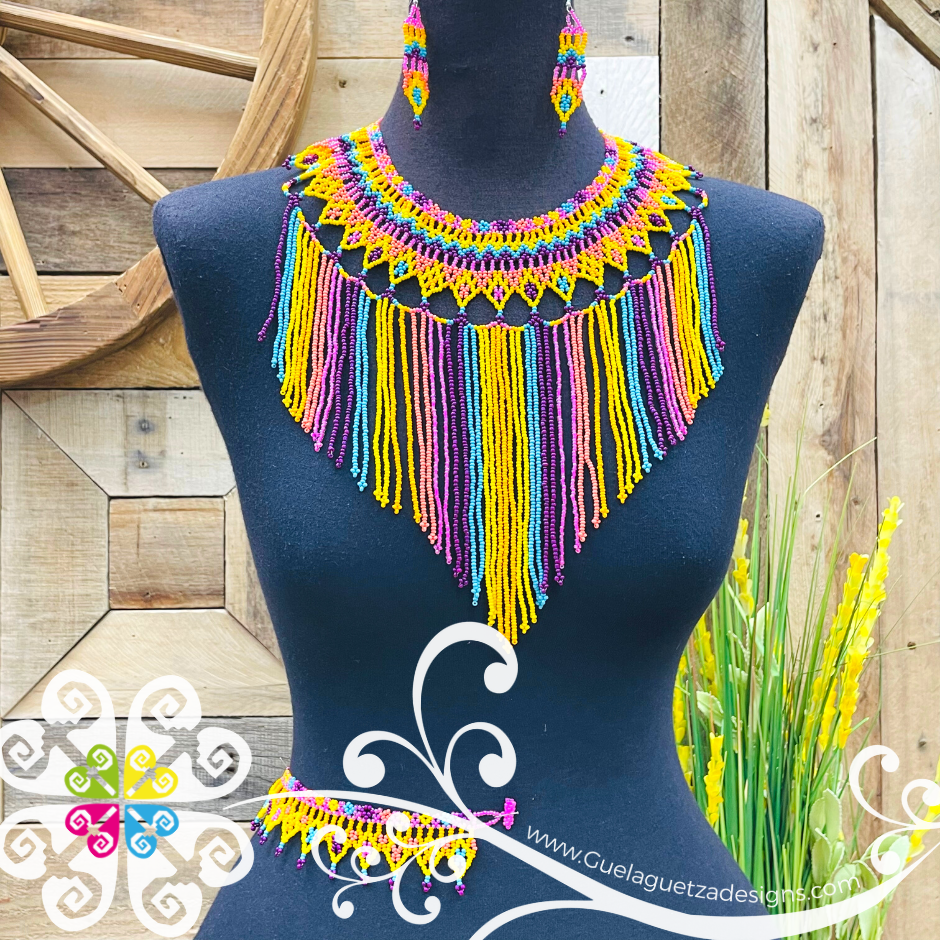 Beautiful 3 piece set that includes matching earrings, necklace and bracelet so you look amazing next time you go out. Each design is made with petite glass beads, featuring super cute symmetric designs made with different colors that can go from vibrant rainbow palette or just subtle tones.