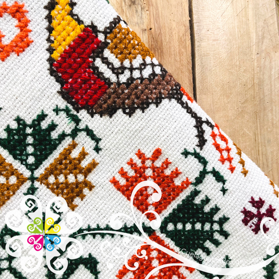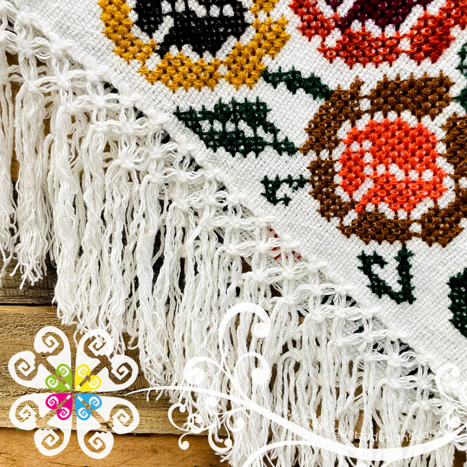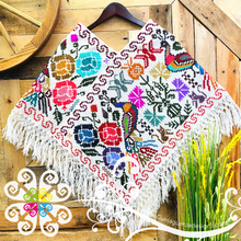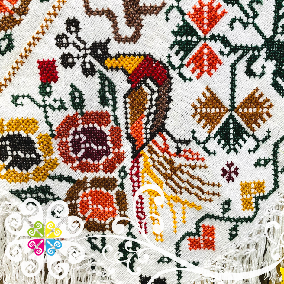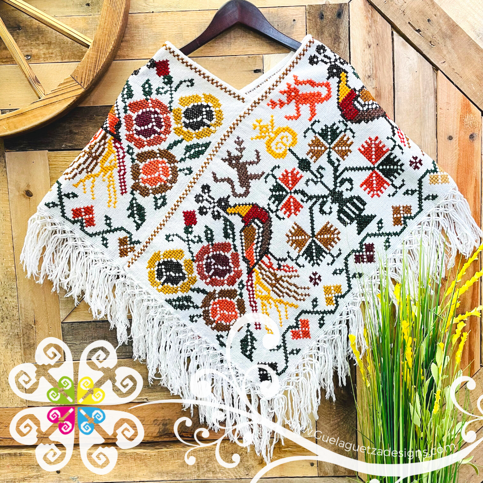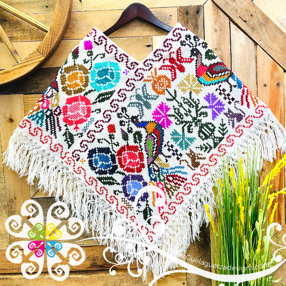 Beautiful one of a kind embroider poncho. Base is made with plain cotton threads and decorated with hand made cross stitch embroider. Featuring a beautiful peacock, flowers and shapes inspired Mexico's flora and fauna. Same design in front and back.