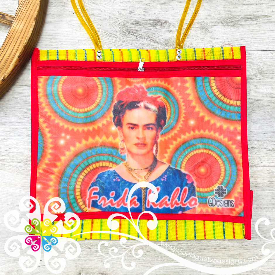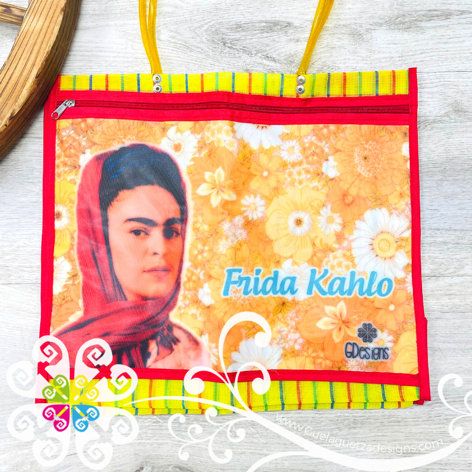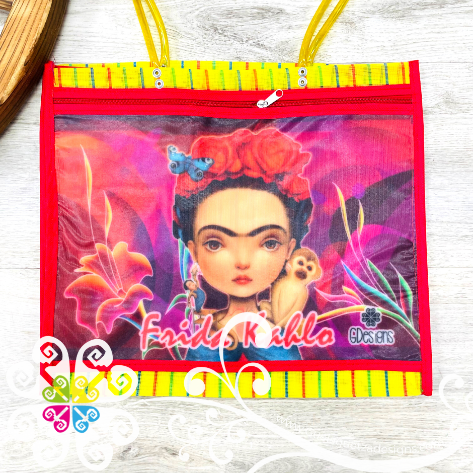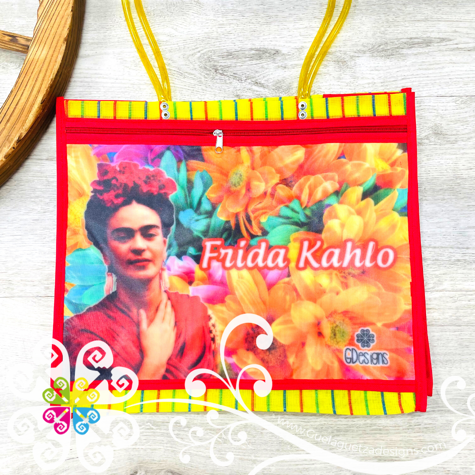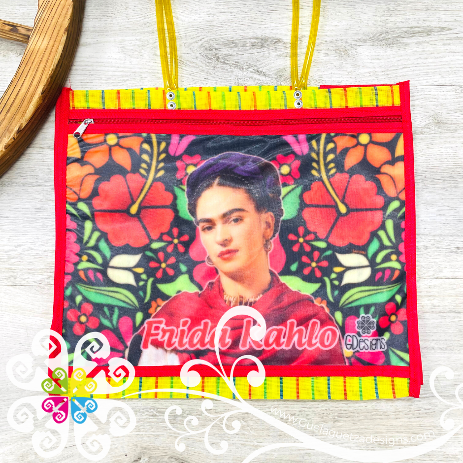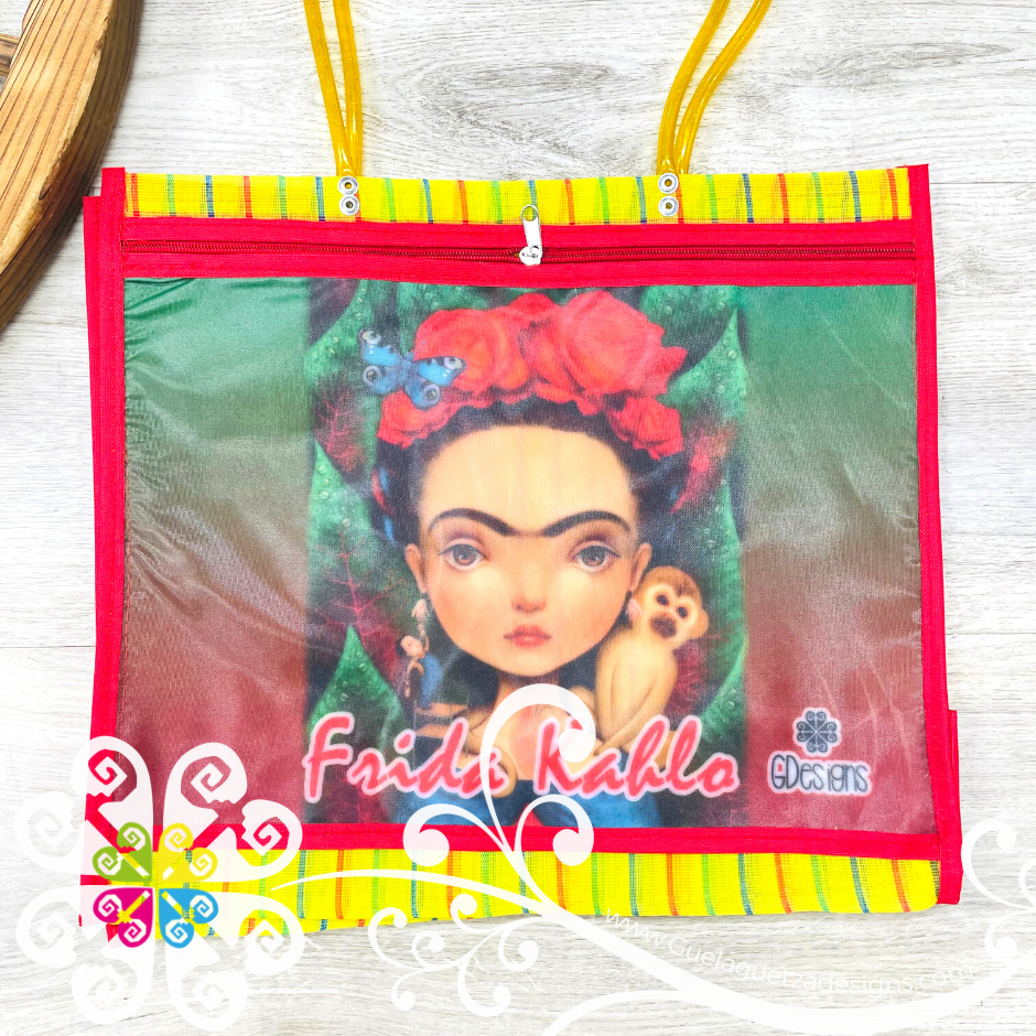 Inspired on the great Frida Kahlo! Morral made with mesh material, front large pocket with zipper to secure your belongings. Very resistant material, water proof! Perfect for grocery shopping, beach bag, laptop bag or just about anything!