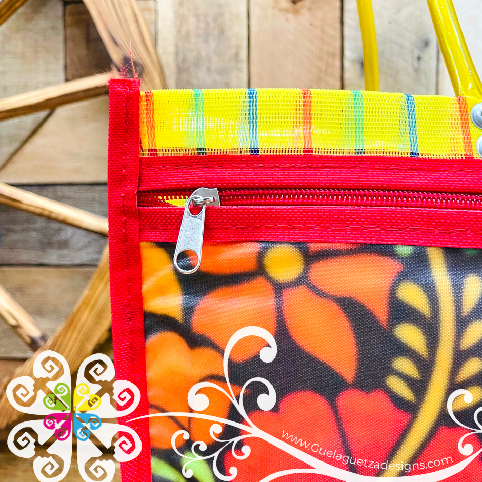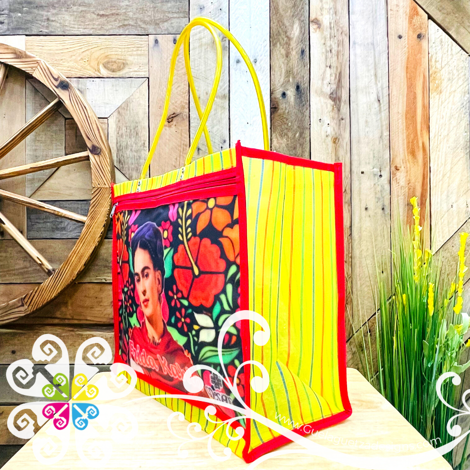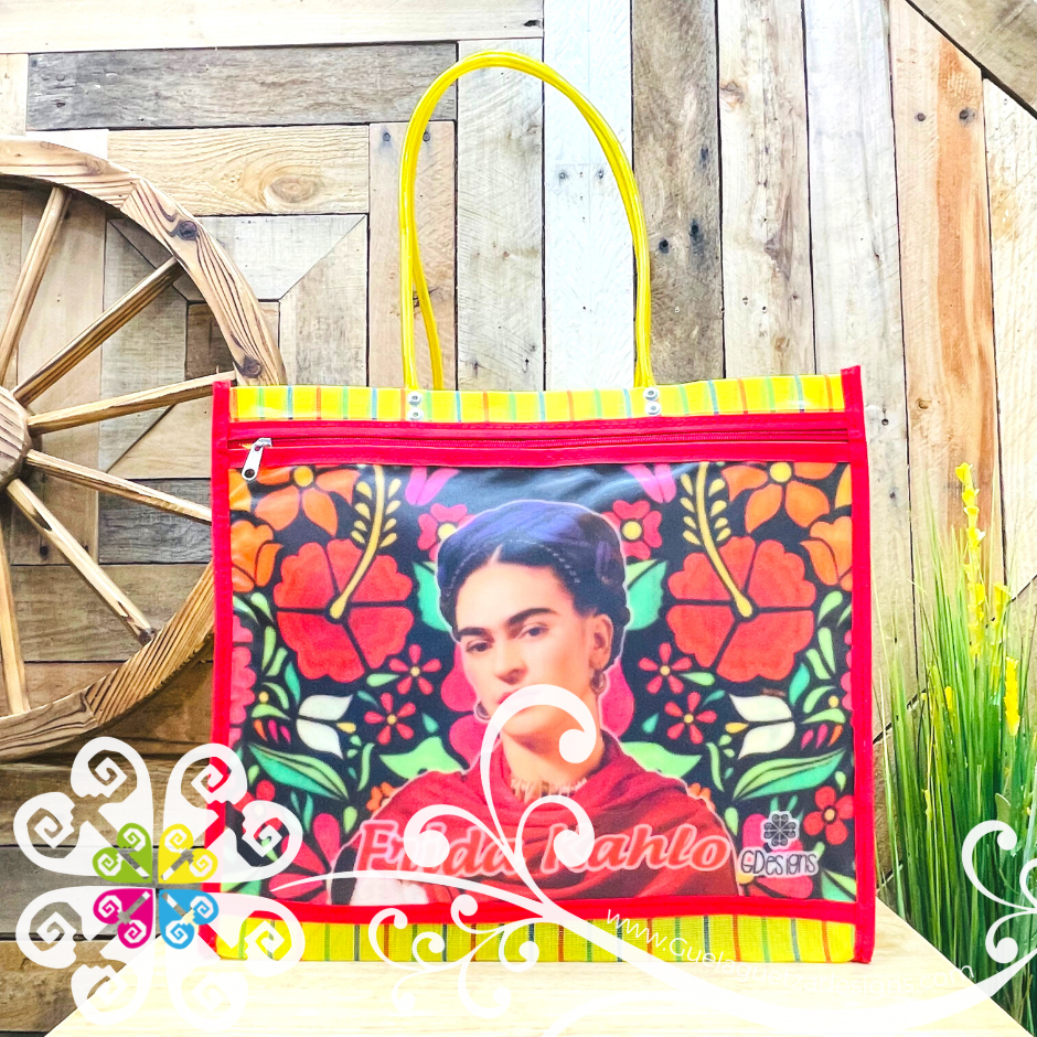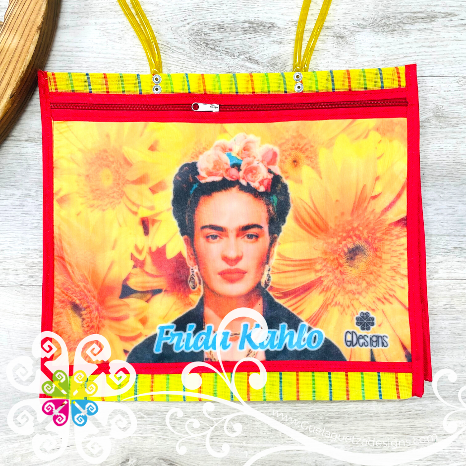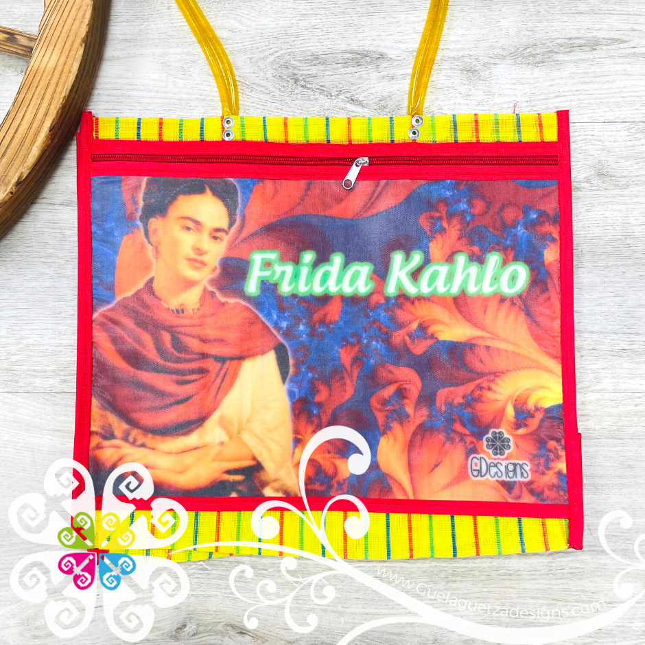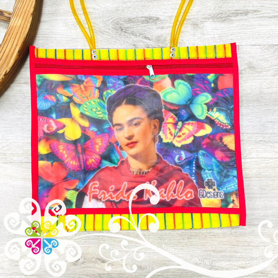 Inspired on the great Frida Kahlo! Morral made with mesh material, front large pocket with zipper to secure your belongings. Very resistant material, water proof! Perfect for grocery shopping, beach bag, laptop bag or just about anything!