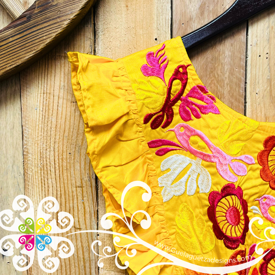 Elegant and authentic Tehuana dress with machine embroider made by local artisans from la costa de Tehuantepec, Oaxaca. The top features beautiful geometrical shapes and flower designs embroider with silk threats. The Poplin Fabric offers a comfortable aspect, and elastic around the waist that helps better shape your body, its the perfect dress for a night out!